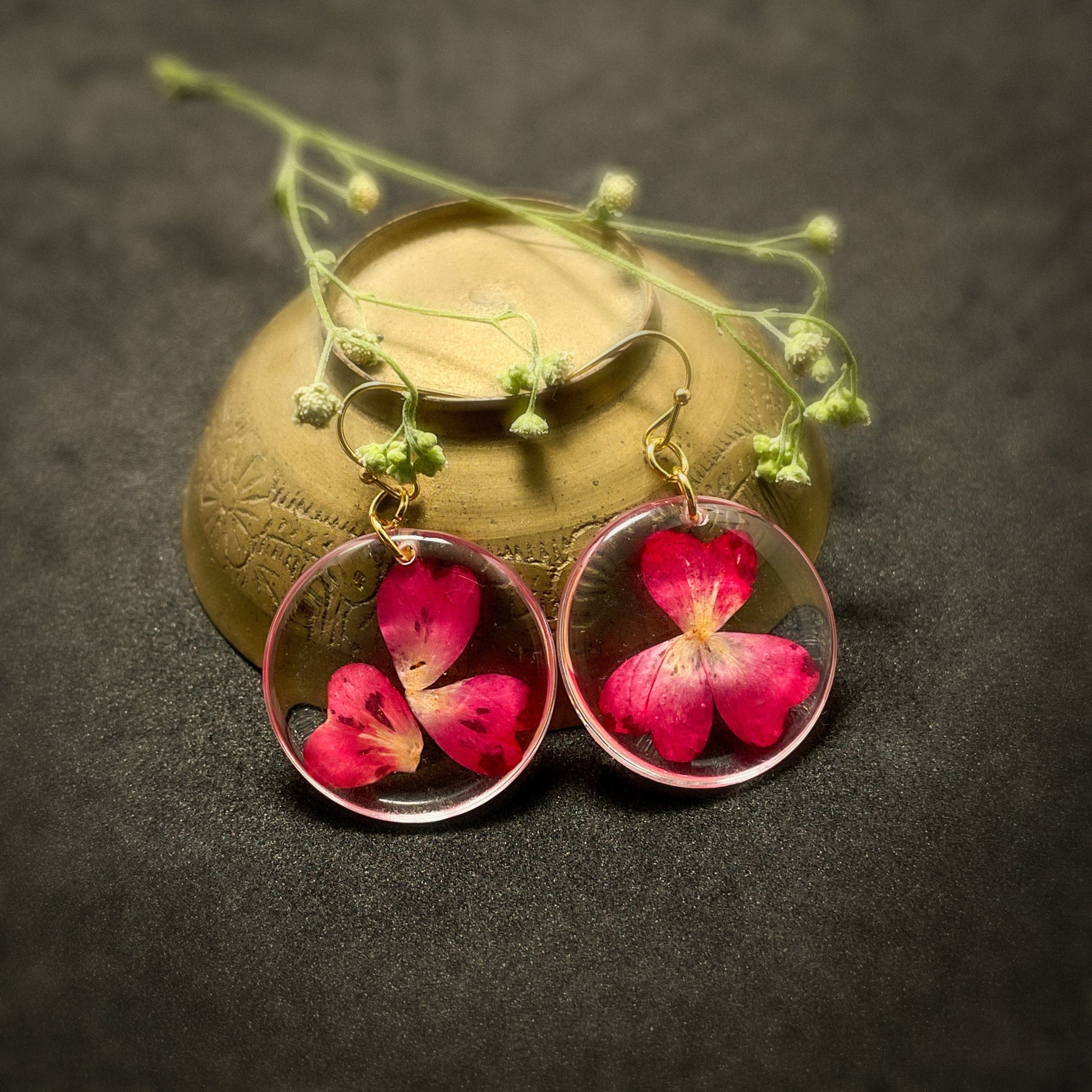 Indulge in the delicate beauty of these Ephemeral Red Cherry Keepsake Drops. Each earring features a single red cherry blossom petal, hand-picked at the peak of its bloom and carefully preserved in resin to capture its natural beauty. The cherry blossom's crimson hue is both striking and elegant, and is perfectly complemented by the shimmering resin that encases it.