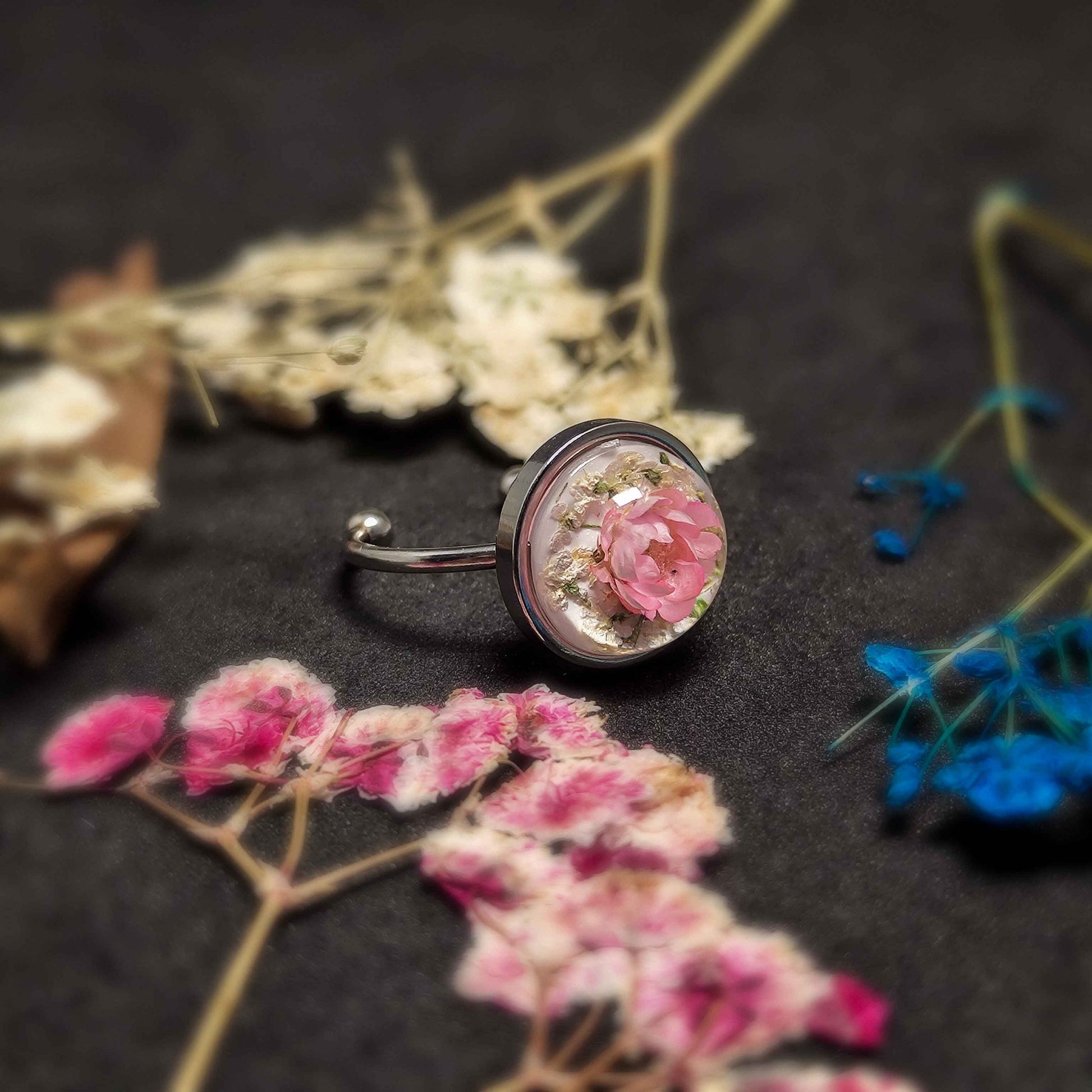 In this botanical wonderland, delicate dried flowers found their eternal sanctuary. Nestled within the embrace of a lustrous stainless steel band, the ring becomes a precious vessel for nature's ephemeral treasures. Each petal, thoughtfully preserved, carries a whisper of the past, capturing the essence of a blooming moment frozen in time.