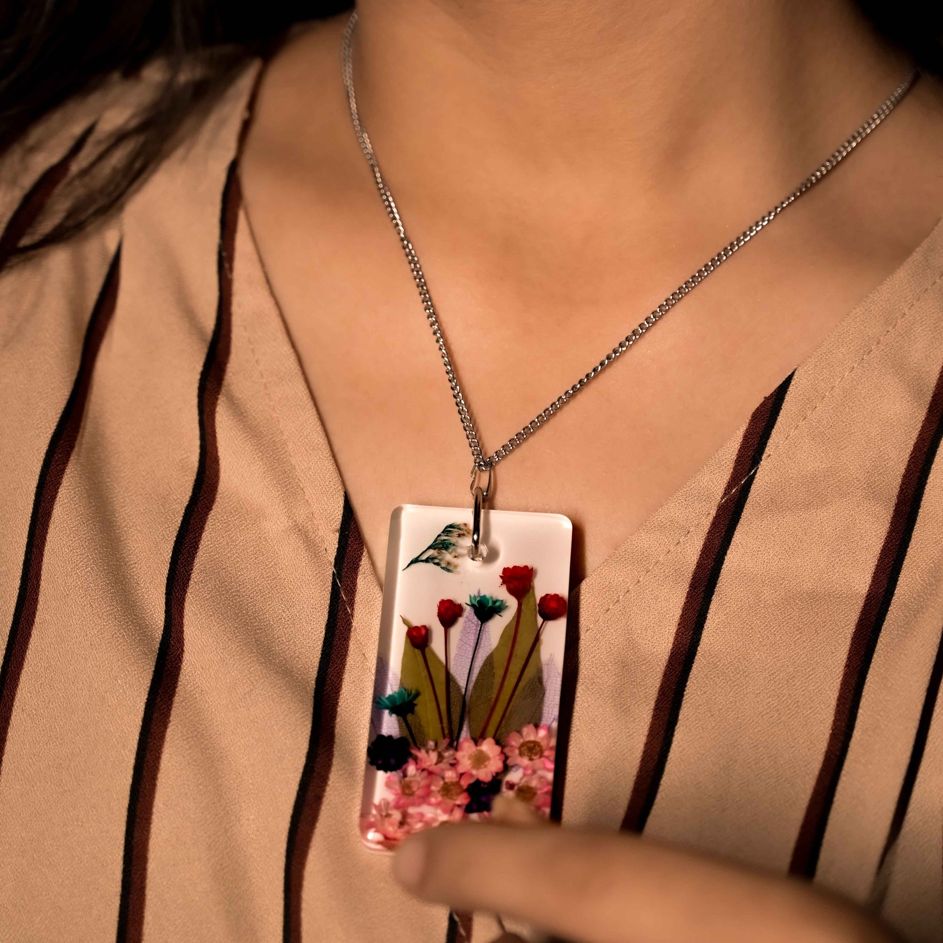Wear a piece of floral paradise around your neck! Our Petal Potpourri Paradise Necklace, part of Perky Diva's Floral Castle Collection, incorporates a mix of unique, preserved botanicals to create a vivid garden on your neckline. Enjoy the beauty of Brazilian pink flower, bamboo leaf, blue verbena hybrida, red gypsophila, and purple leaf - each flower specially picked and preserved for a lifetime of style. Get ready for your garden of style to bloom!