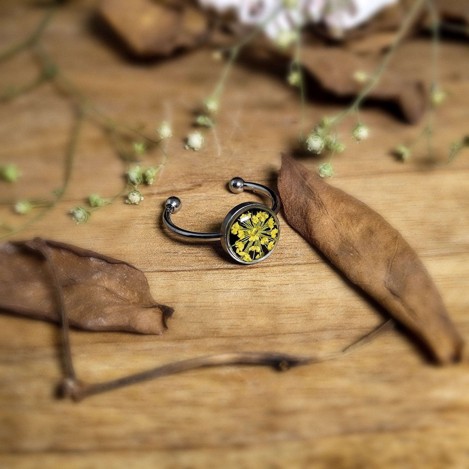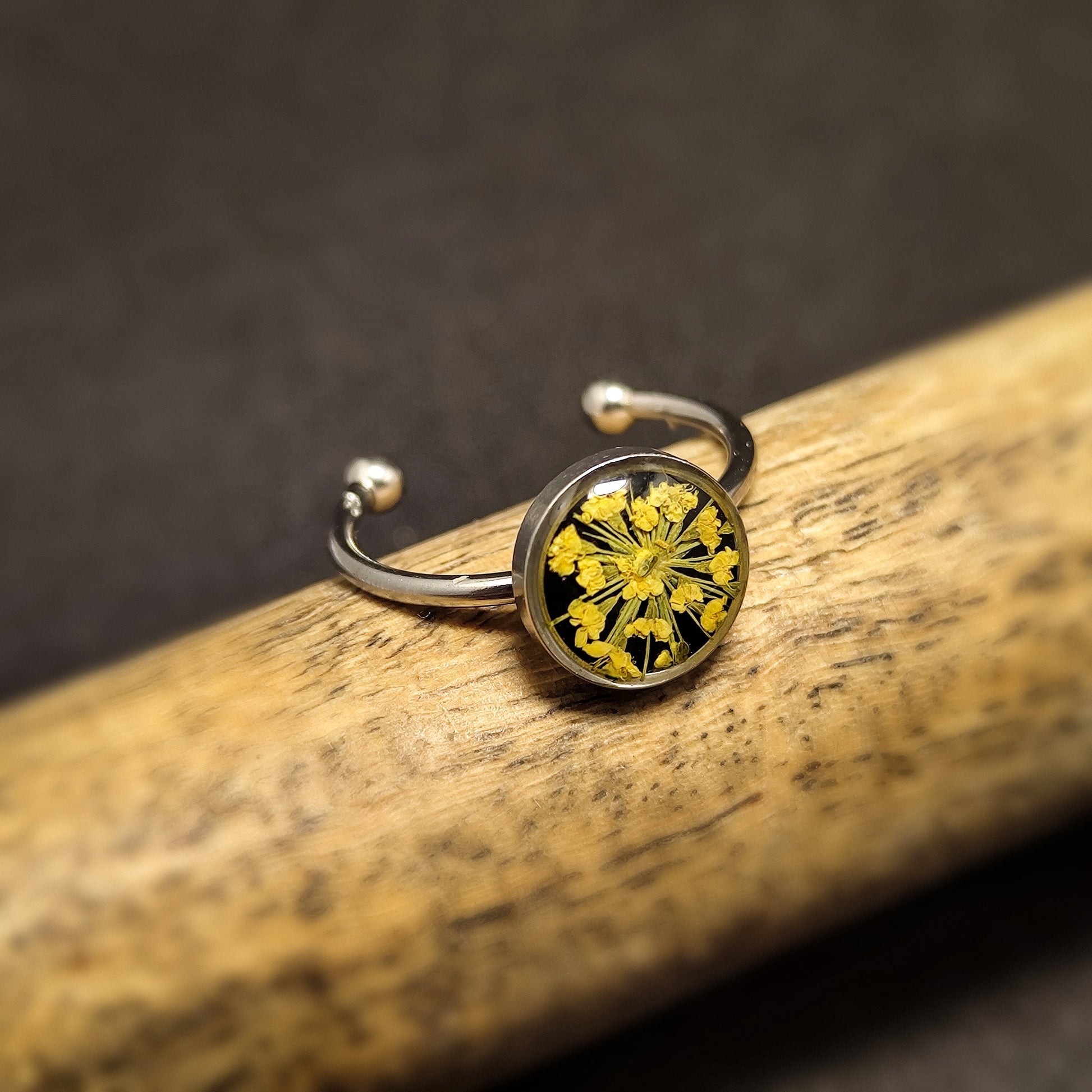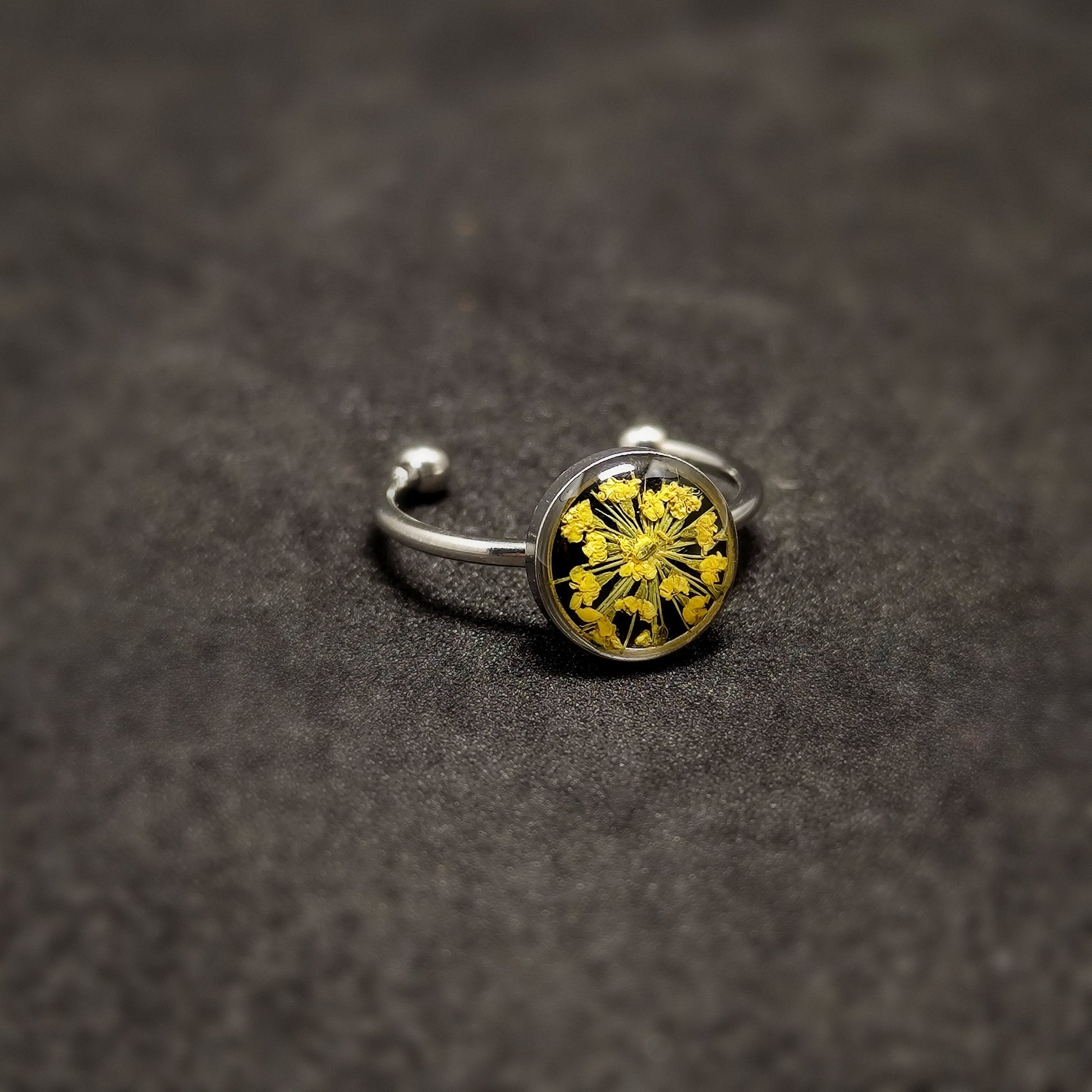 Crafted with meticulous precision, this ring features a mesmerizing black background that serves as the backdrop for a vibrant yellow lace flower. The contrast between the darkened canvas and the radiant bloom evokes a sense of intrigue and allure, as if capturing a fleeting moment of ethereal beauty.